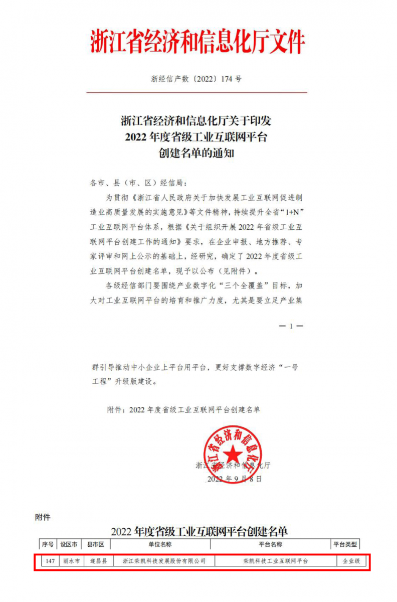 2022年9月,浙江省經(jīng)濟(jì)和信息化廳發(fā)布了《2022年度省級(jí)工業(yè)互聯(lián)網(wǎng)平臺(tái)創(chuàng)建名單》浙經(jīng)信產(chǎn)數(shù)[2022]174號(hào),浙江榮凱科技發(fā)展股份有限公司工業(yè)互聯(lián)網(wǎng)平臺(tái)成功入選省級(jí)工業(yè)互聯(lián)網(wǎng)平臺(tái)創(chuàng)建。